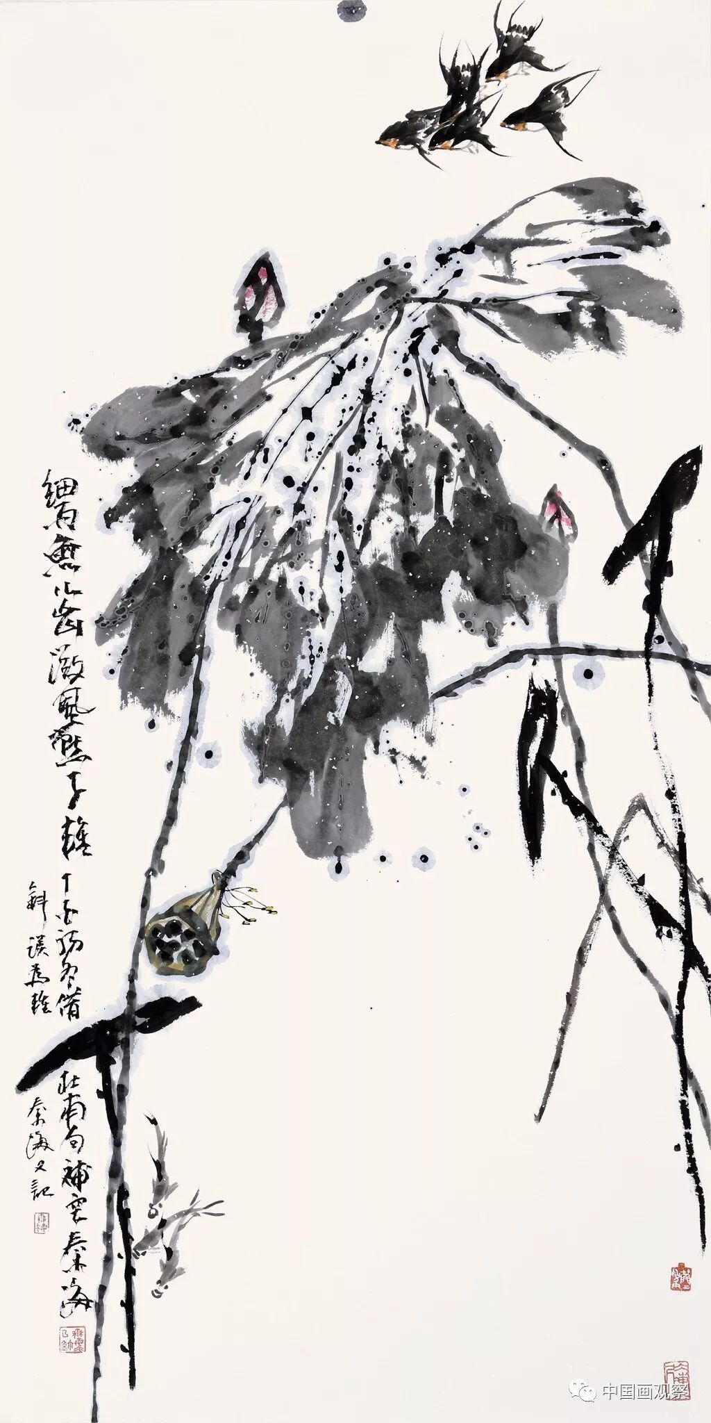 中国画学会副会长、中国艺术研究院研究员邓福星:我一直很关注秦海先生的艺术创作,关注他的写意花鸟画。从上世纪80年代,我就注意到他是非常用功的一个画家,很善于动脑子思考。最近几年看到了他的新作品,我发现他提升了很多,他的画一看就是很放得开,是一种很强的写意风格,很率意,很率性,不拘泥,不拘谨,不修饰。这背后有一种艺术激情,创作的一种热情,有一种真情实感的流露。再一个是他的这些作品,我们看起来在画面的构成上,是很舒服的,我觉得他在构思这个画面上很讲究一种势,一种气势,整个画面实际上是我们说的那种气韵,他是很讲究的。同时他也博采吸收一些西方艺术的构成,所以画面里面浓淡虚实、疏密轻重都处理得非常好,特别有些作品表现这种动感的画面,是很生动的。有一些是表现一种静态的也很精彩,刚柔的线条令人回味无穷,这是他的一个很重要的特点。